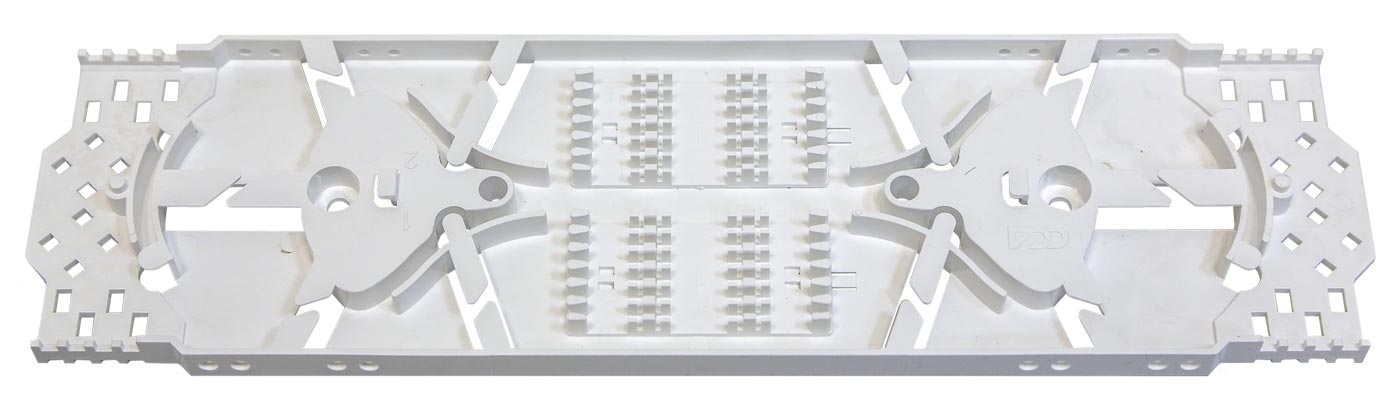 Узкая кассета К24-4525 для укладки до 24 сростков ОВ используется в поворотных и выдвижных полках кроссового решения высокой плотности ВОКС-Ф. На кассете установлено два съёмных ложемента Л-12 для размещения гильз КДЗС-4525.